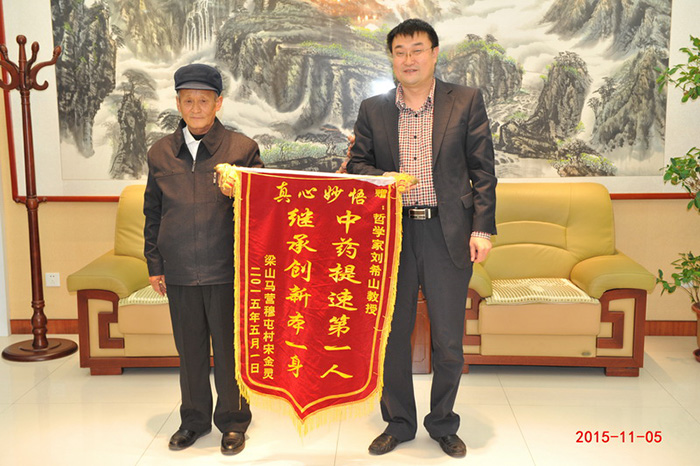 | “中药提速是伟大的创新,是值得全社会推广的创新!刘希山教授是我一生中最佩服的人,他是哲学家、医学家!他写的书(《希山格言选》)太好了,我常常看,把他书中的格言都背过了,还讲给很多人听,大家听了都很受教育!” 2015年11月5日,行医48年、年届70岁的残疾退伍军人宋金灵,不顾儿女劝阻,不远千里单身赴盛宏医药拜访“哲人奇人”刘希山教授,并替梁山康复患者敬献锦旗。原来,宋老先生在行医过程中遇到很多传统疗法难以解决的疑难杂症,近年来使用刘教授发明的中药提速透化疗法为一例例顽疾患者解除了病痛,其中有糖尿病并发症医院诊断只能截肢者,有严重腰椎间盘突出患者,有患妇科病不能生育者……神奇的疗效让老人看到了中医药的新天地。