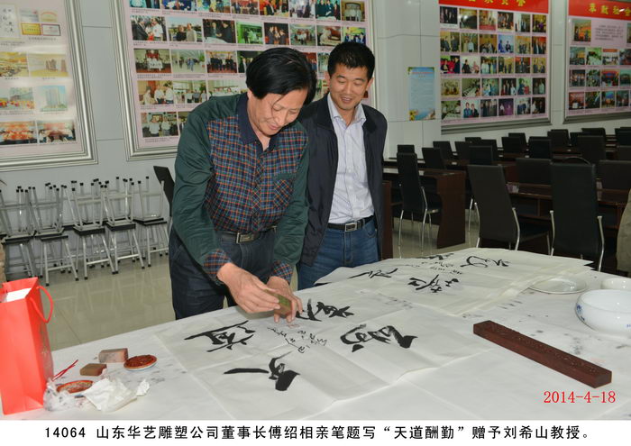 2014年4月18日,山东华艺雕塑公司董事长傅绍相陪同美国教授李比利等十二人莅临盛宏公司参观访问,刘希山董事长亲自陪同客人参观,并向客人们详细介绍了中药提速的发明过程,以及在治疗股骨头坏死、腰椎间盘突出等顽疾方面取得的成绩。比利教授对刘希山董事长发明的中药提速治愈千千万万患者的事迹深感敬佩,为亲眼见到这样一个为人类健康做出突出贡献的中国企业和这样一位中医药界的泰斗感到荣幸。客人们还参观了盛宏四馆一书,他们对刘希山董事长著作《希山格言选》高度评价,对盛宏四馆丰富的藏品、浓郁的文化感到震撼。 李比利是美国北卡罗来纳大学格林波若分校艺术学院著名教授,艺术家。傅绍相先生是高级工艺美术大师,被誉为“中华雕塑第一人”。他在雕塑艺术的成就使得他当选为中国艺术铸造协会副理事长等职务,并先后荣获山东省“青年星火带头人”、山东省“当代儒商”等荣誉称号。