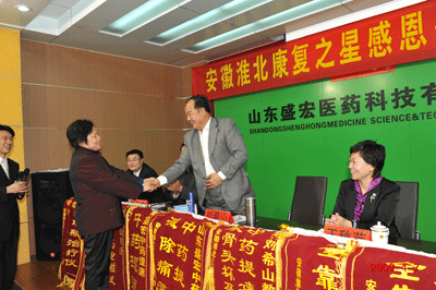 盛世春风抚绿大地,中药提速康复万民。2009年4月7日,安徽淮北股骨头坏死、腰椎间盘突出、骨质增生等各类顽疾康复患者感恩团160余人携带着锦旗抵达中药提速的发源地——山东省潍坊市,开始了他们感恩盛宏公司、面谢中药提速第一人刘希山教授的感恩活动。三辆大巴依次驶进山东盛宏医药科技有限公司大门,受到刘希山教授、王秋萍总经理和盛宏公司全体员工的热烈欢迎。