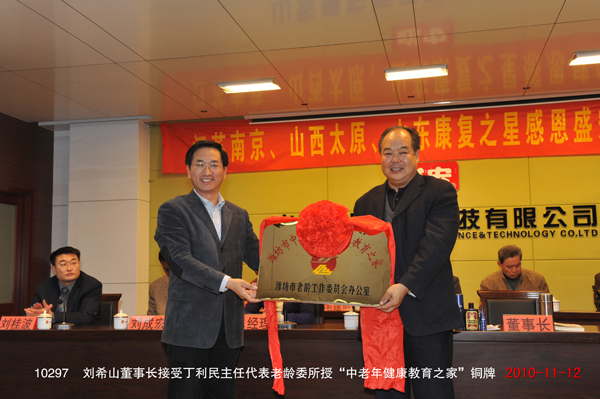 2010年11月12日,盛宏公司双喜临门,一是江苏南京、山西太原和山东的近300多名康复之星不远千里来到盛宏总部谢恩,谢恩者达到了25省100余地市104批总计一万三千多名;二是潍坊市老龄委授予盛宏公司“中老年健康养生教育之家”授牌仪式、盛宏-渤海书画院书画联谊会在这里同时举行。市老龄工作办公室党组书记、办公室主任丁利民,潍坊渤海书画院院长辛炳申,盛宏公司董事长刘希山、总经理王秋萍,渤海书画院的书画家以及各地服务中心主任在主席台就坐。