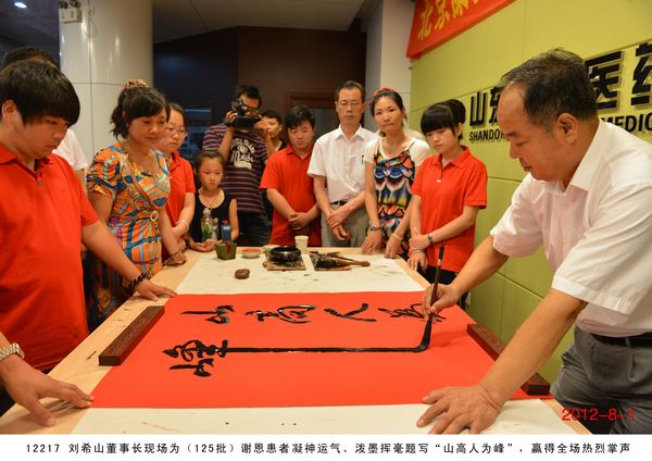 第 125 批北京感恩盛宏行到达 2012 年 8 月 1 日 ,北京近 200 名骨病顽疾康复患者到达盛宏公司谢恩并向刘希山教授献上锦旗,谢恩者达到了 27 省、 100 多地市、 125 批、 22000 多人次。盛宏公司依靠中药提速 35 项专利和独特的疗效,创造出了世界治疗骨病顽疾和医患和谐的两大奇迹 。中国民族医药开发委员会副会长、潍坊市道德模范、盛宏公司董事长、中药提速专利发明人刘希山教授应邀为谢恩者作健康报告 ,赢得首都客人热烈 欢迎。 为回报大家的厚爱, 刘希山董事长还向客人们赠送了治疗烧烫伤和创伤的纯中药产品“创伤净”,并应邀现场献上墨宝,他的一笔“龙”“虎”、三才“福”“寿”、“山高人为峰”等作品受到客人们高度评价并争相收藏。 |