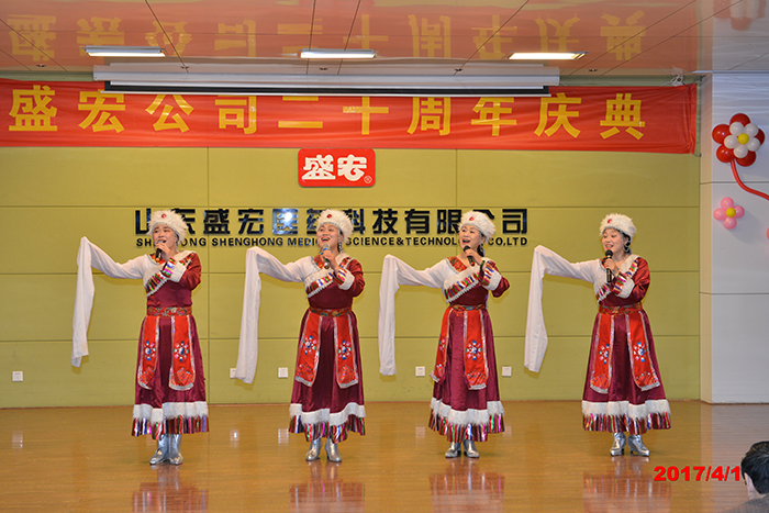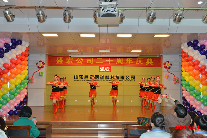 盛宏公司举办二十周年庆典 2017年4月1日,盛宏公司彩球飘飘、锣鼓锵锵,多功能会议室里舞姿翩翩、歌声激扬,盛宏二十周年庆典在这里欢快举行。山东省优秀共产党员、中药提速专利发明人、公司董事长刘希山与夫人乔桂美,全国三八红旗手、公司总经理王秋萍,以及盛宏公司董事会成员出席庆典,全体员工观看了演出。山东单县县委宣传部为盛宏公司的爱心捐献特别颁发了荣誉牌匾。华风书画院院长吕传义、荣誉院长周瑞春等友人闻讯莅临盛宏祝贺,并献上了大气精美的书画作品。肺癌晚期康复患者林秀民女士再次赴盛宏谢恩,并以矫健的身姿表演了《太极扇》。 |