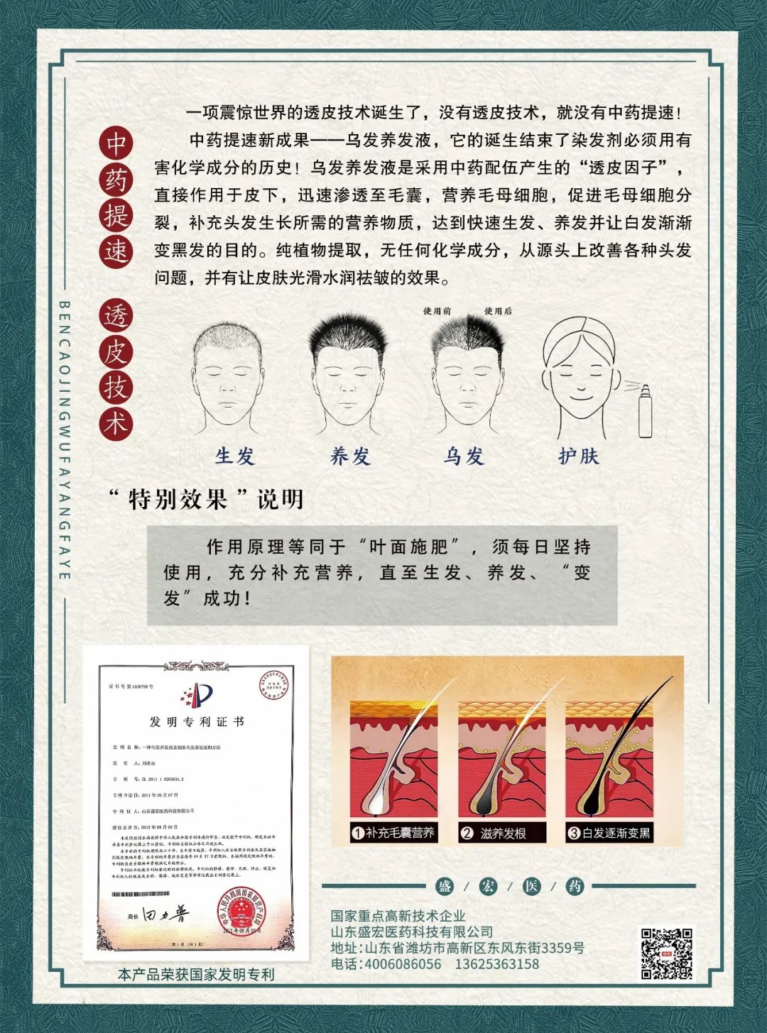 新品的发明来自一项震惊世界的透皮技术;没有透皮技术,就没有中药提速。乌发养发液是中药提速新成果,它的诞生结束了染发剂离不开剧毒对苯二胺的历史。乌发养发液是采用中药配伍产生的“透皮因子”,直接作用于皮下,迅速渗透至毛囊,营养毛母细胞,促进毛母细胞分裂,补充头发生长所需的营养物质,达到快速生发、养发并让白发渐渐变黑发的目的。纯植物提取,无任何化学成分,安全程度近似于牛奶,从源头上改善各种头发问题,并有让皮肤光滑水润祛皱的效果。