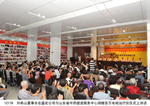 2012年6月19日,山东盛宏医药科技有限公司与山东省中药提速服务中心开展了百万赠送献爱心活动,刘希山董事长亲自出席赠送活动并为患者作了心贴心的演讲,祝愿他们在中药提速的治疗下快速康复。来自全省各地的200多名收入中下的顽疾患者怀着激动的心情现场领取了国家专利产品——盛宏牌电磁治疗仪。获赠者参观了盛宏公司万旗馆、博物馆、图片馆等盛宏六馆,全国27省123批康复患者献给盛宏公司的12000多面锦旗更增加了他们治愈股骨头坏死、腰椎间盘突出、肝病、肾病等顽疾的信心。 盛宏公司在刘希山教授大爱精神的指导下,以《希山格言选》为做人做事的教材,以老卫生部长钱信忠老人“中药提速,造福人民”的题词为理念,近年来先后捐款捐物达到了980多万元,受到社会各界高度评价。全国政协原副秘书长、中华慈善总会副会长张道诚,山东省原副省长、省慈善总会会长谢玉堂等领导曾先后到盛宏公司参观调研。