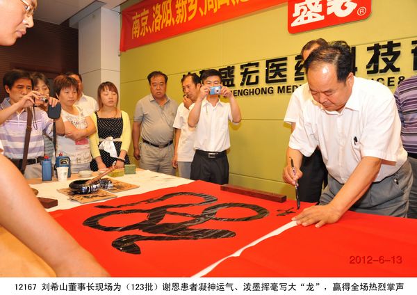 “中药提速,济世良医”、“弘扬中医国粹,振奋民族精神!” 2012年6月13日,南京、洛阳、新乡、周口、连云港等两省五地市的300多名康复患者手托着一面面锦旗到达盛宏公司谢恩。因治愈了股骨头坏死、腰椎间盘突出、关节炎、肩周炎等顽疾到盛宏拜谢刘希山教授者,已经达到了27省、100多地市、123批、22000多人次。 刘希山董事长与王秋萍总经理放下手头工作热情接待大家。南京康复患者王老先生握住刘希山教授的手说:“你不是一个凡人哪,你是一个了不起的人!”谢恩用户崔有智女士向刘教授献上锦旗后眼含泪水,她哽咽着说:“谢谢刘教授!您就是妙手回春、华佗再世!”大家抢着与刘教授握手、抢着与刘教授合影、抢着与刘教授交谈的热情感动了所有在场的人,也让大家看到了经皮给药、速克顽疾的电磁治疗仪是多么受欢迎,真正的济世良医是多么受社会尊重。 刘希山教授为大家作了精彩的中药提速健康报告,并应五地服务中心主任和康复患者邀请献上墨宝。他凝神静气,展臂挥毫,笔随气走,神从笔现,大“福”、高“寿”、飞“龙”、卧“虎”,跃然纸上。正当大家啧啧称赞之时,身边却出现了三位客人争抢“寿”字的“突发现象”,刘教授宽厚的面容微微一笑,连说两声“再写,再写”,使得争抢的客人顿时脸色发红,而全场响起热烈的掌声。 部分康复病例 1、崔有智,女,69岁,患膝骨关节炎多年,疼痛难忍,行动不便。去过好多大医院效果均不明显,后经朋友介绍使用盛宏电磁治疗仪,2012年2月份开始用,4个月后病痛竟奇迹般的解除,而且前一段时间还出国去了加拿大,也没有再犯,完全康复了。亲戚朋友都感觉非常神奇。最后她激动地说:“刘希山教授真是妙手回春,华佗再世!” 2、黄万忠,男,77岁,15年来义务为大家修路一条,荣获江苏省“劳动模范”、连云港“爱心市民”称号。他多年劳作患上了腰椎间盘突出、腿疼等疾病,20多年来住过医院、贴过膏药、做过针灸,病情均无起色,偶然的一次机会了解到了盛宏电磁治疗仪,经过专家的细心讲解、指导,使用1个月后,感觉腰慢慢有了好转,后来又继续使用半个月后, 2012年6月已基本康复。 3、赵剑梅,女,66岁,患有退行性膝关节炎十几年,痛苦不堪,几乎不能走路,孩子们带着出国求医问药都没有治好。后经朋友介绍了解电磁治疗仪,到店里试用了几次感觉效果不错,连续使用仅半个月,至2012年6月已基本康复。 4、杜文光,男,75岁,周口人,患有腰椎间盘突出、风湿性关节炎十几年,严重的时候不能自理,吃饭、走路都要家人帮忙,常年受病痛的折磨,痛苦不堪,做过按摩、针灸、贴过膏药病痛依然没有减轻。自己的亲姐姐、姐夫使用电磁治疗仪治愈了多年的腰椎病、肩周炎后向其介绍,本人抱着半信半疑的想法,试用一个疗程后,感觉腿不那么疼了,全身轻松了好多。连续使用三个疗程,到现在2012年6月病痛已经完全消失。他激动的说:“刘教授是我的恩人,以后我还会继续来看望我的恩人。” 5、魏绪德,男,76岁,连云港人,患有股骨头坏死、骨质增生, 03年发病,到医院治疗医生建议做手术,手术费需要几万元,由于家庭条件并不富裕,不治回家。他常年卧床不起,其痛苦“像上刑一样”,后来家人多方打听了解了电磁治疗仪,抱着试试的心态,使用11天后,腿慢慢有了知觉,能自己坐起来了,激动万分,自己慢慢看到了希望,后来连续使用3个月,能自己拄拐下床走路了,使用10个月后,2012年6月跟正常人一样,病情完全康复。到医院复查,医生看了惊讶地说:“不可思议,奇迹!”