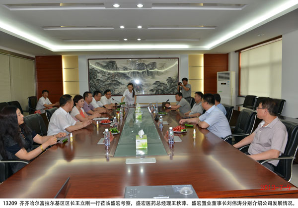 2013年7月9日,黑龙江省齐齐哈尔市富拉尔基区政府区长王立刚一行莅临盛宏集团公司参观考察,盛宏医药公司总经理王秋萍、盛宏置业公司董事长刘伟涛分别向客人们介绍了医药公司、置业公司、酒店管理公司、中医院、小额贷款公司等旗下公司的经营情况,并陪同客人们参观了“盛宏四馆”。 王立刚区长对盛宏在治疗股骨头坏死、腰椎间盘突出、颈椎病、腹部肿瘤等顽疾领域取得的成绩表示赞叹,对盛宏中医院独特的中医中药疗法和“治未病”为主题的做法给予充分肯定,并对“盛宏四馆”和刘希山董事长亲笔撰写的《希山格言选》给予高度评价。