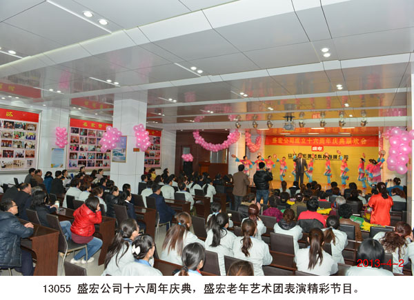 2013年4月2日是盛宏公司十六华诞,早上8:30,公司大会议室座无虚席,刘希山董事长、王秋萍总经理与全体员工在这里举办十六周年庆典活动。这次庆典没有通知任何媒体和行政部门领导,但仍有很多社会各界的朋友闻讯前来祝贺。